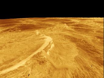 Авторы: Nasa На поверхности Венеры часто встречаются вулканические структуры. Одна из таких вулканических особенностей, называемая "часы", изображена на фотографии. Эта структура представляет собой вулкан шириной около 35 км на вершине горы, от которой по радиусам расходятся горные хребты и ущелья, как будто здесь сидит насекомое.