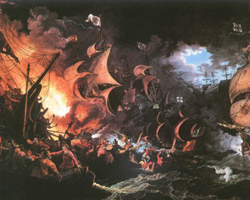 По Тоталитарной Испании мы имеем на сегодняшний день две официально высказанные гипотезы и это вынуждает к поиску дополнительных аргументов. Одним из них может стать знаменитая история с гибелью "Непобедимой армады". Если взять за основу вариант высказанный в "Поисках харизматика-30", то мы получаем Идеологический период четвертой фазы в интервале (1597-1609). Имперская Третья Англия в свою очередь провела Идеологический период третьей фазы в интервале (1569-1581). Легко заметить, что теоретический Рубеж времени должен был случиться в 1589 году. Хотелось бы напомнить, что натолкнулась на Рубеж и погибла "Армада" в 1588 году. Ну а в 1589 году Норрис и Дрейк нанесли "ответный" удар навестив Испанию и Португалию в своем пиратском набеге | | Кваша Г. С. · Идеологические войны · 30-05-2012 |  |