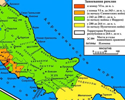 К 350 году Рим уже имел полный контроль над Лацием и Южной Этрурией и продолжил экспансию в другие районы Италии. В 343 до н. э. жители Капуи перешли в римское подданство, что вызвало Первую Самнитскую войну (343—341) - победа римлян и подчинением Западной Кампании. Потом Вторая Латинская война (340—338) - роспуск Латинского союза, конфискация земель латинов... Вторая (327—304) и Третья (298—290) Самнитские войны - разгром Самнитской федерации... Рим укрепил своё влияние в Лукании и Этрурии, установил контроль над Пиценом и Умбрией и овладел Сенонской Галлией, превратившись в гегемона всей Средней Италии. Проникновение в Южную Италию привело в 280 к войне с могущественным Тарентом и его союзником эпирским царём Пирром. | | Кваша Г. С. · Первый Рим · 27-10-2024 |  |
