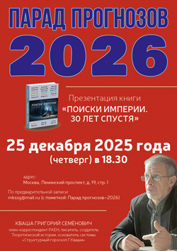 Главное событие года для нашей системы! Встреча всех друзей и соратников! И конечно "Волшебный календарь - 2026" с автографом автора. Но и это не всё - презентация новой книги: "Поиски Империи. 30 лет спустя". "Парад прогнозов" состоится в четверг, 25 декабря в Энергетическом институте (Ленинский проспект, дом 19, строение 1) в 18.00. В программе отчёт по прежним прогнозам, политический прогноз на 2026 год, а также тенденции построения Русского мира (с 2029 года). Прогноз по странам, политическим и медийным лицам. И конечно же, прогноз по знакам... Само собой, Г.С. ответит на все Ваши общие, а может быть и некоторые частные вопросы. Подпишет книги и календари. Новогоднее настроение гарантируется! Ждём Вас! Регистрация обязательна. Пишите на адрес: mkssg@mail.ru с пометкой "Парад прогнозов". | | Кваша Г. С. · Новости МК ССГ · 08-12-2025 |  |