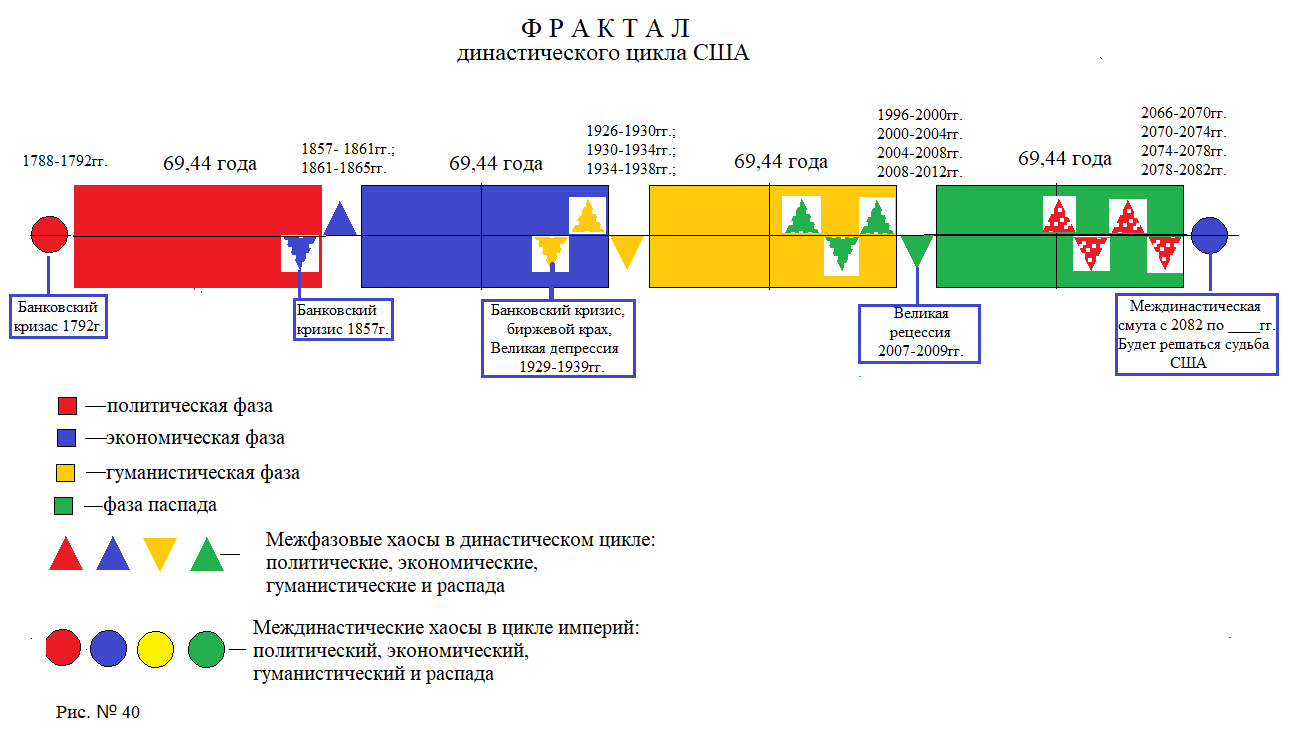 Как можно видеть на графике фрактала династического цикла (Рис. № 40) США, государство формировалось в период с 1788 по 1792 год. В этот период в США происходили ключевые события, связанные с формированием гос-ударственности, принятием Конституции и Билля о правах, первыми президент-скими выборами, а также финансовыми кризисами.